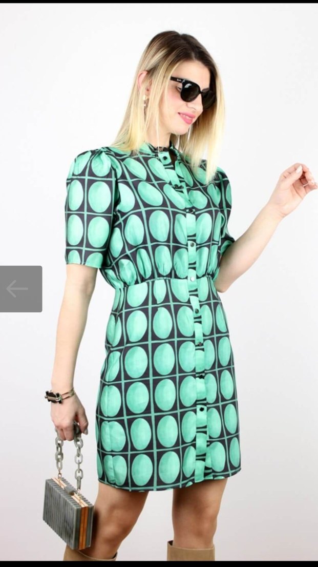 Düğmeli, kısa kollu, yakalı ve yeşil retro puantiyeli mini elbise. Rahat sentetik kumaştan, günlük kullanım için uygundur. Orjinal Zara.L beden,ölçüleri görsellerde. Tertemiz.