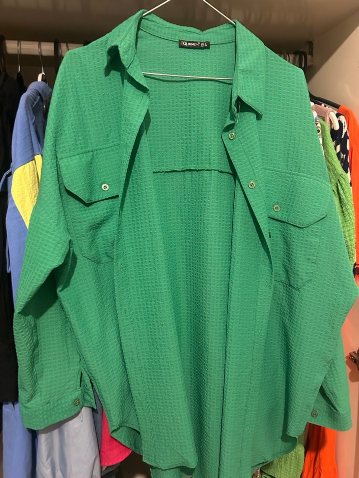 Uzun kollu, düğmeli ve çıtçıtlı cep detaylı salaş yeşil kadın gömleği. Sentetik kumaştan hiçbir sıkıntısı yoktutır l beden de tercih edebilirsin