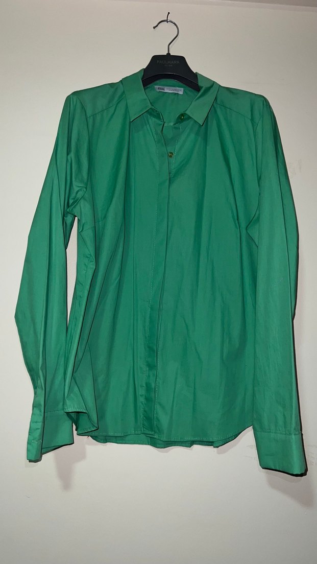 Bu yeşil kadın gömleği, uzun kollu, yakalı ve düğmeli tasarıma sahiptir. Saten dokusu ve bol kesimi ile ofis kullanımı için uygundur.
