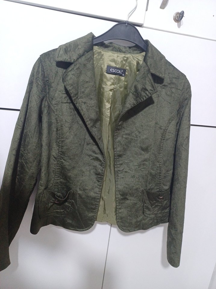 Düğmeli, yeşil süet blazer ceket, yakalı ve uzun kolludur. Midi boyda, parlak dokusu ile ofis için uygundur.