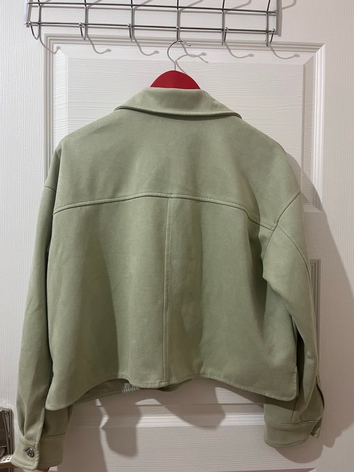 Düğmeli, yeşil süet kumaştan, notalı yakalı ve uzun kollu, rahat kesim günlük kullanıma uygun kadın ceket.