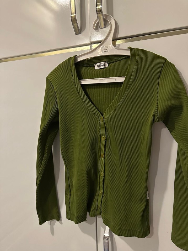 Düğmeli, yeşil renkli, uzun kollu ve V yakalı.Yumuşak keten kumaştan, normal midi boyda ve minimalist tasarıma sahip.