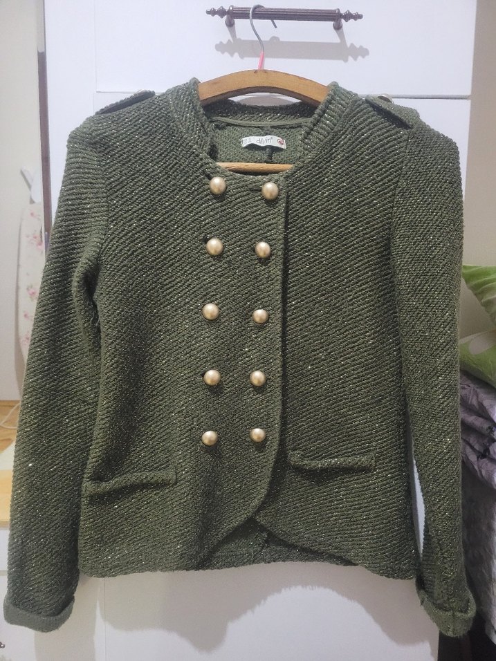 Düğmeli, parlak yeşil renkli, triko kadın ceket. Uzun kollu, normal boyda ve kesimi vücuda oturan, rahat ve sade tarzda tasarlanmıştır.