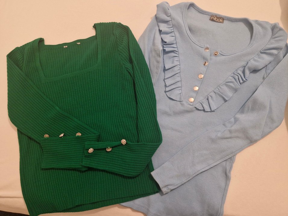 Düğmeli Yeşil Triko Kadın Kazak ve Bebe Mavisi Bluz