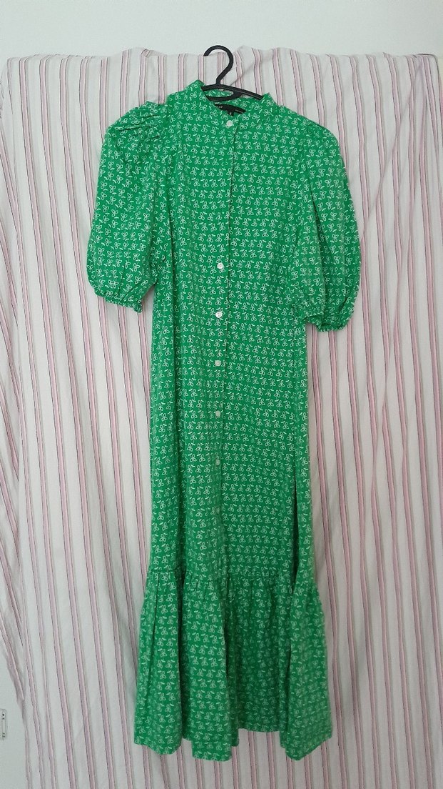 Düğmeli, kısa kollu, yüksek yakalı, bol kesim uzun yeşil elbise. hic giyilmedi. midi boydur.