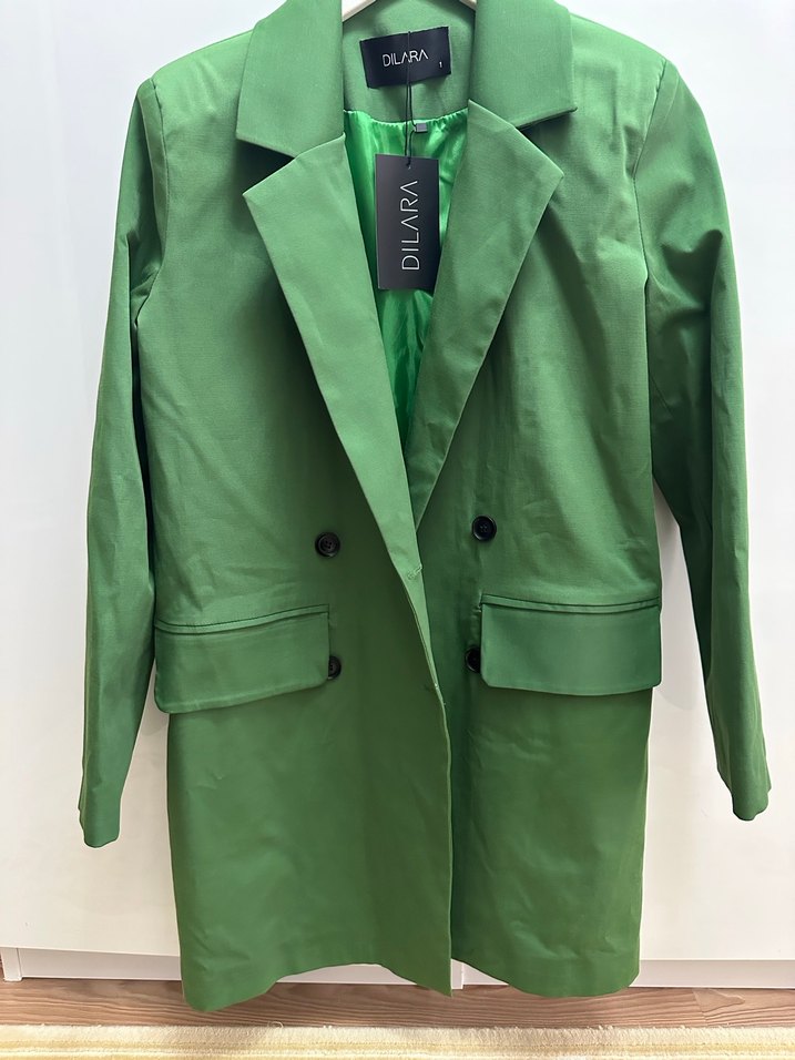 DILARA markalı, parlak yeşil uzun kadın blazer. Düğmeli, kesik yaka ve uzun kolludur. Ofis için uygun, rahat kesim ve sentetik kumaştan üretilmiştir.