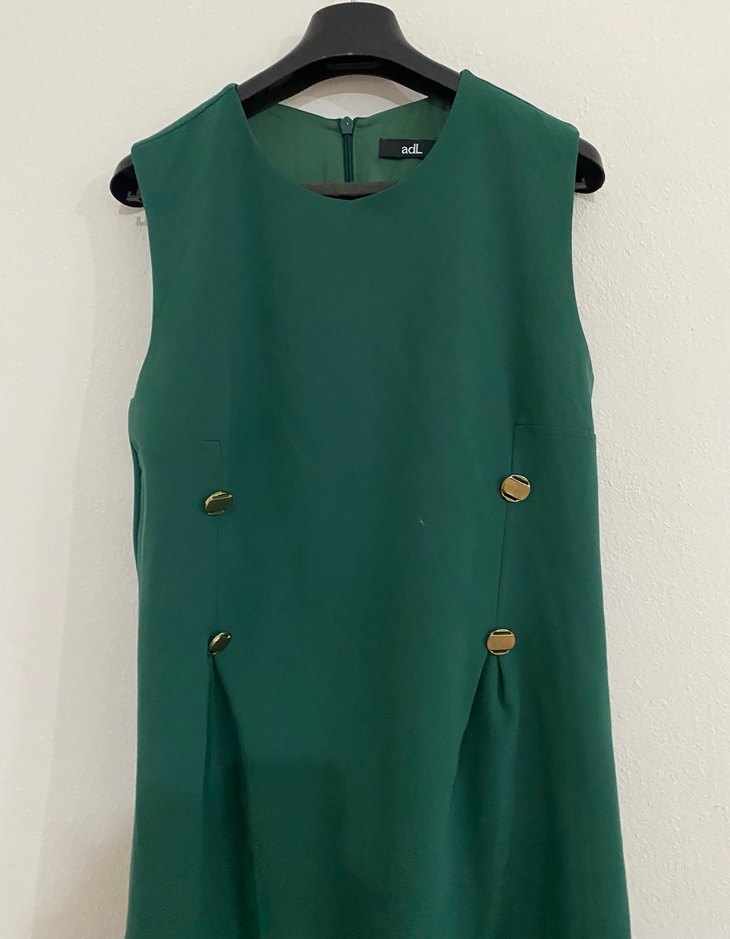 Düğmeli, yuvarlak yakalı, kolsuz yeşil uzun elbise. Düzenli kesim ve parlak kumaşla ofis için uygun.