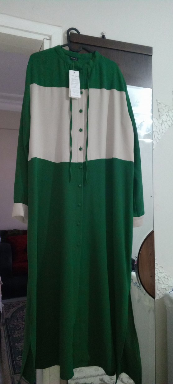 yeni ürün etiketli 48 beden iade yoktur❌❌ Düğmeli, uzun kollu, bol kesim bu elbise parlak yeşil ve beyaz renk bloklarıyla, tekdüze ve tekne yakalıdır, günlük kullanıma uygundur.