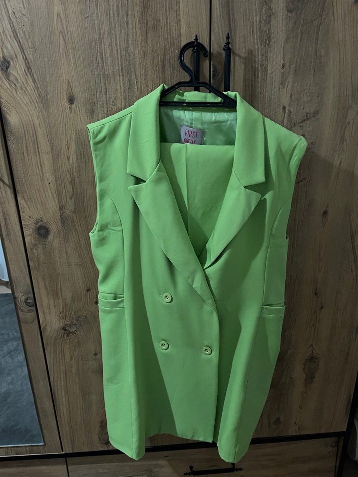 Düğmeli Yeşil Uzun Kesim Kolsuz Blazer ve Pantolonu