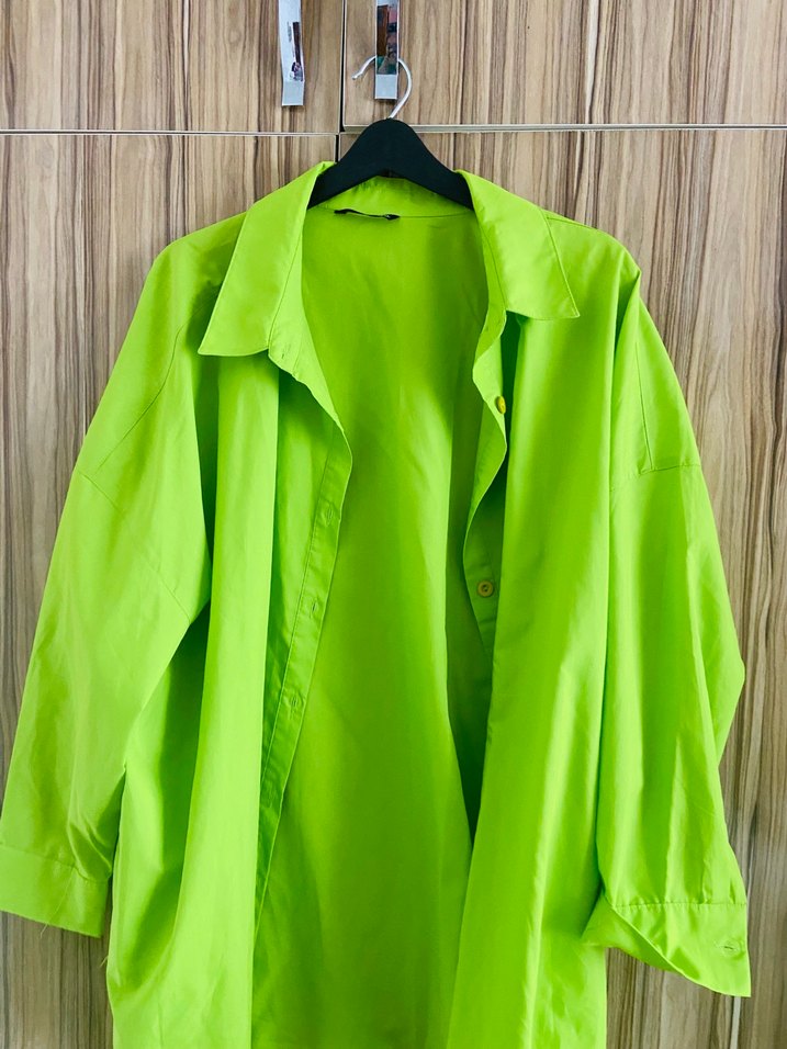 Düğmeli, uzun kollu, keten kumaştan, notalı yaka detaylı, parlak yeşil renkli bol kesim gömlek. Günlük kullanıma uygundur.