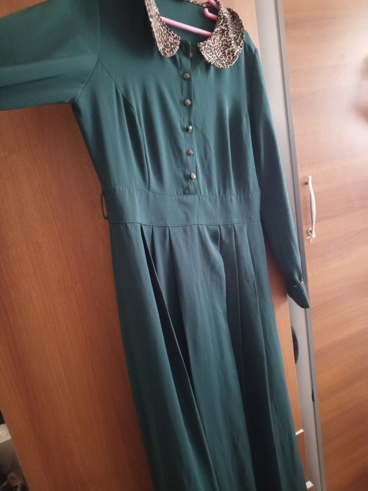 Leopar desenli yakaya sahip koyu yeşil uzun kol elbise. Düğmeli, düzenli kesim ve sentetik kumaştan üretilmis