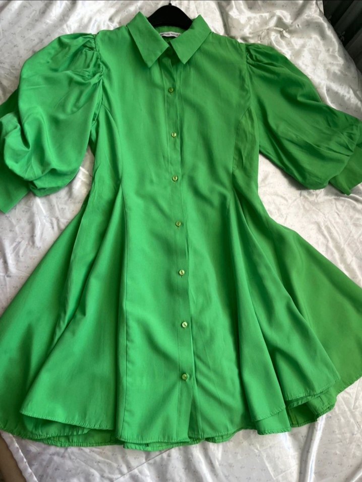 Parlak yeşil renkli, yakalı, düğmeli ve kısa balon kollu, bol kesim bohem tarzda uzun elbise.