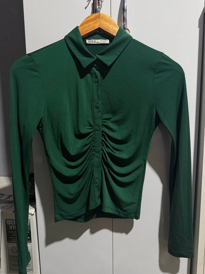 Düğmeli, yakalı ve uzun kollu bu yeşil kadın bluz, vücuda oturan kesimi ve toplanmış detaylarıyla ofis ve günlük kullanıma uygundur.