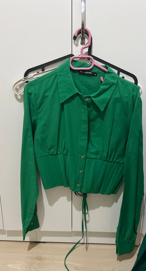 Yeşil, düğmeli, uzun kollu, yakalı ve parlak görünümlü kadın gömleği. Sokak tarzı için uygun, vücuda oturan kesim. Crop ve korseli