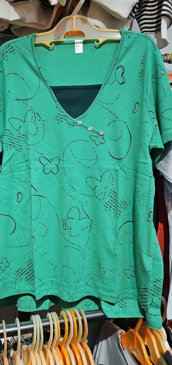 Rahat kesim, V yaka, kısa kollu yeşil hamile tişörtü. Yumuşak pamuktan, renkli kelebek desenli ve düğmeli detaylıdır. Günlük kullanım için uygundur.38.42.46.48.50.54 bedenler mevcuttur