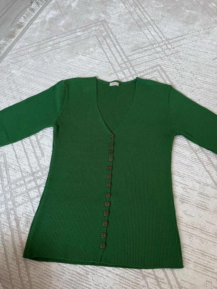 Düğmeli, uzun kollu, V yakalı yeşil triko kazak. Fitted kesimi ve rahat dokusuyla günlük kullanıma uygundur.