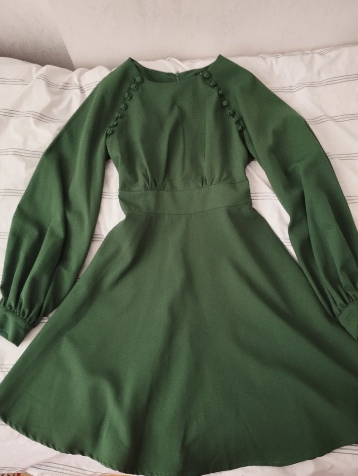 KIZLAR MÜTHİŞ BİR ELBİSE BAKIN MÜTHİŞ BEĞENMESEM SİZE ALIN DEMEM RENGİ İLK FOTOĞRAFTAKİ GİBİ AZICIK BELİNİ DARALTTIM VE BİR DÜĞMESİ KOPTU AMA DİKTİM ORAYI İNDİRİM YAPIYORUM Düğmeli, uzun kollu, yeşil vintage uzun elbise. Rahat kesimli, yuvarlak yaka ve yumuşak sentetik kumaştan yapılmıştır.