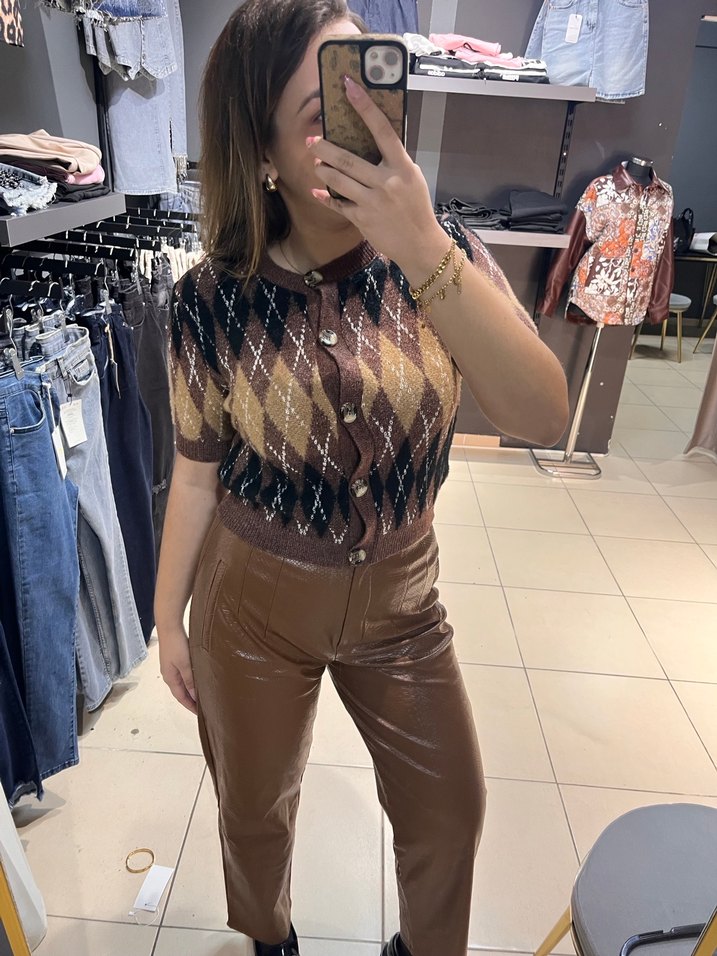 Parlak kahverengi deri, yılan derisi desenli, düğmeli, bol kesim ve midi boy kadın pantolon, trend sokak stili için uygundur.