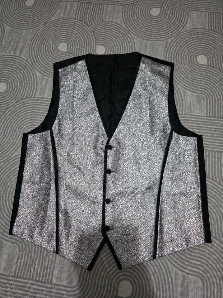 Düğmeli, yılan desenli gri erkek yelek. Kolsuz, kesik yaka ve normal kesim, midi boy sokak stili için uygun.
