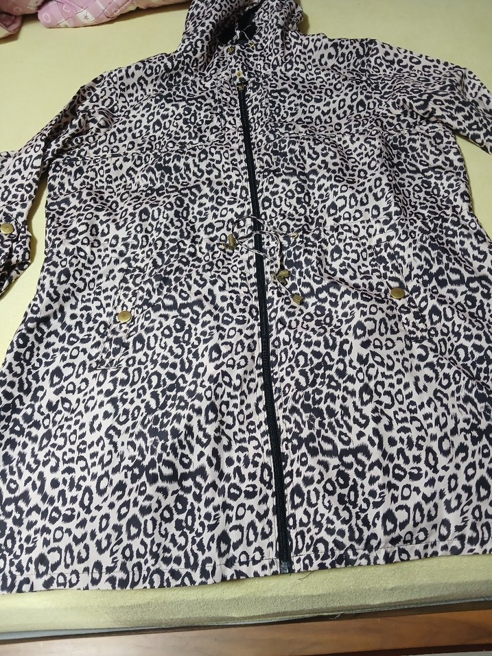 fermuarlı,leopar desenli, normal boyda, bol kesim kadın yağmurluğu. Notlu yakalı ve uzun kollu, dış mekanlar için uygun.