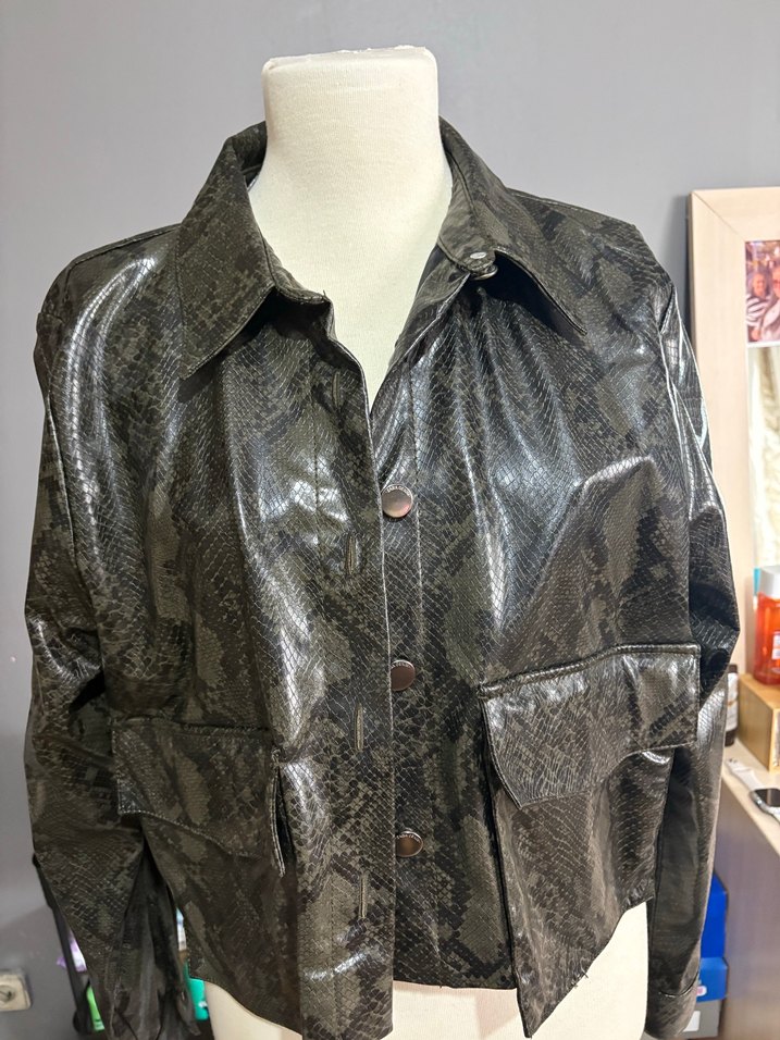 Kahverengi yılan desenli deri ceket, düğmeli, bol kesim ve uzun kolludur. Notlu yaka detayıyla sokak tarzına uygundur.