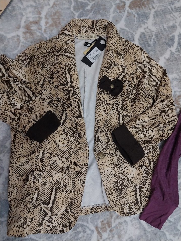 Düğmeli, yılan desenli, normal uzunlukta ve bol kesim kadın kaban. Uzun kollu, sentetik kumaştan, günlük kullanıma uygun.