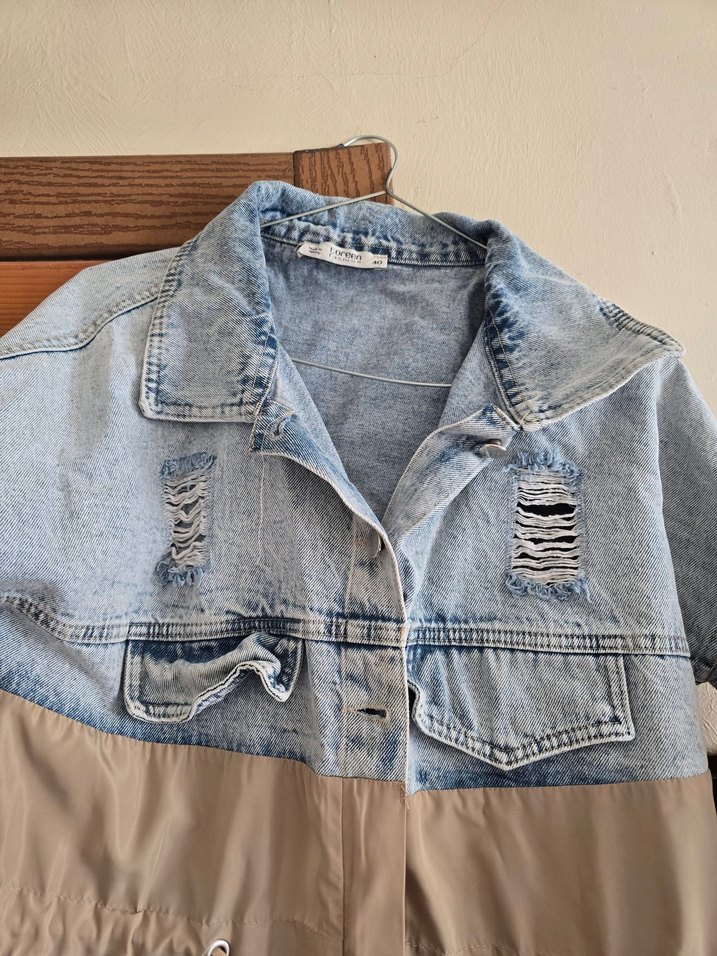 Kadınlar için düğmeli, yırtık detaylı denim trenckot. Notlu yaka ve salaş kesimiyle sokak stiline uygun. Alt kısmı bej kumaşlı, günlük kullanıma uygun midi uzunlukta.