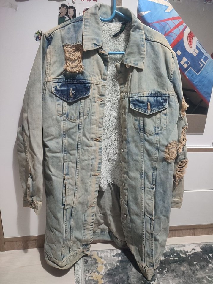 Düğmeli, yırtık detaylı, uzun kesim bol fit denim ceket. Notlu yakası ve uzun kolları ile günlük rahat sokak stili için uygun.