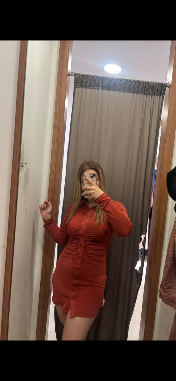 Düğmeli, koyu kahverengi midi elbise, yüksek yakalı ve uzun kolludur. Yırtmaç detayı ve önü düğmelidir, minimalist ve cesur bir tarz sunar.