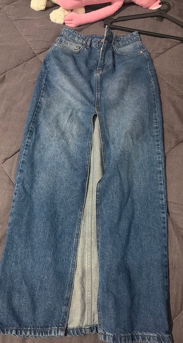 Ön yırtmaç ve düğme detaylı, oturan kesime sahip uzun kot etek. Mavi rengiyle günlük sokak stiline uygundur.