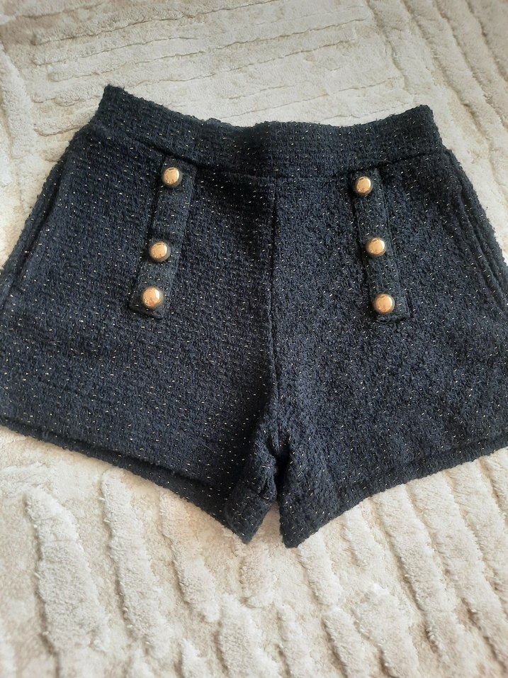 Düğmeli detaylı, nakışlı desenli koyu gri renkli, yüksek bel, triko kumaştan yapılmış, dar kesim kısa şort.