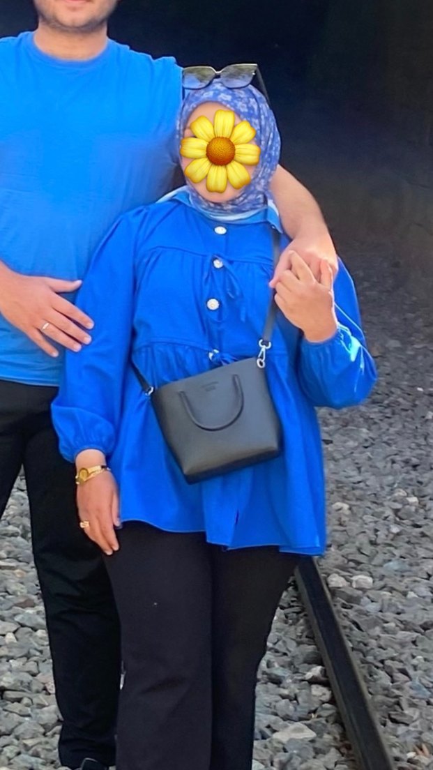 Koyu mavi renkte, yüksek yakalı ve uzun kollu, düğmeli, salaş kesim Hafif batik desenli ve sentetik dokulu, günlük rahat kullanıma uygun.