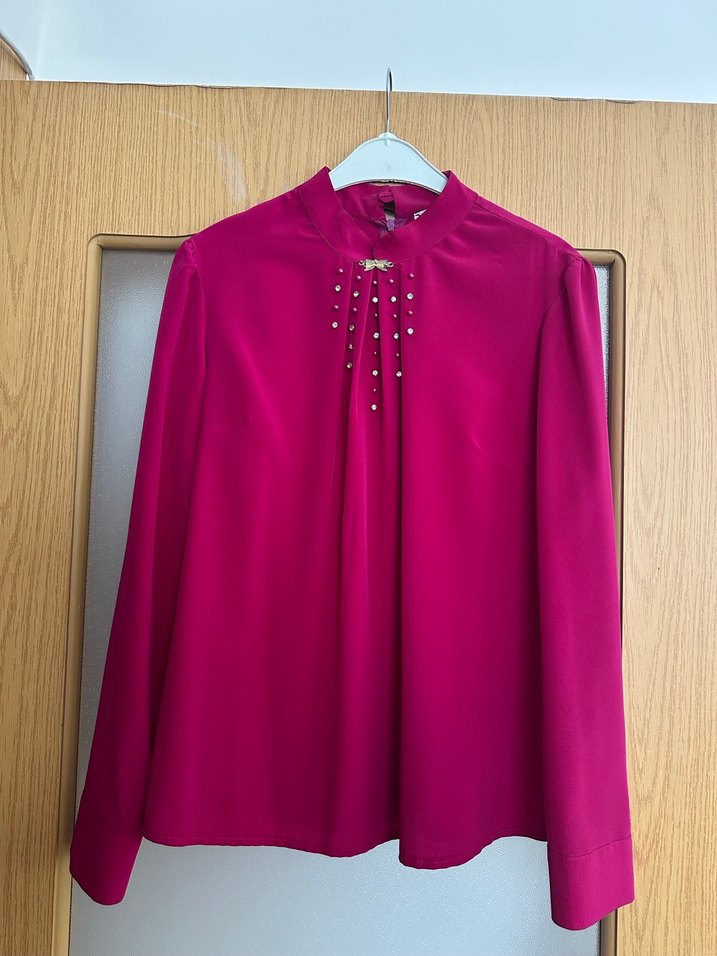 Uzun kollu, yüksek yakalı ve düğmeli, parlak pembe renkte, satenimsi dokuda bol kesim kadın gömlek. Düz desende, ofis kullanımı için uygundur.