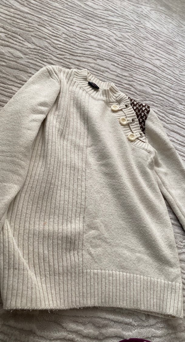 Düğmeli ve yüksek yakalı, uzun kollu, rahat kesim gri kadın kazak. Günlük kullanıma uygun, sade ve konforlu bir tasarıma sahiptir.