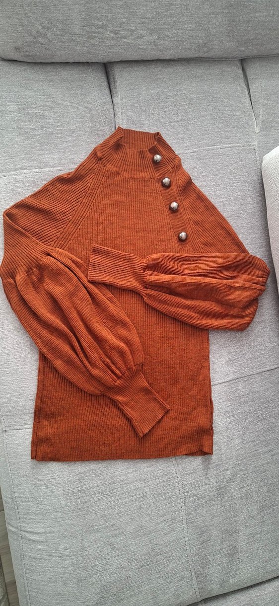 Düğmeli, yüksek yakalı, uzun kollu, bol kesim kahverengi triko kazak. Günlük kullanıma uygun, rahat ve çağdaş tarzda.