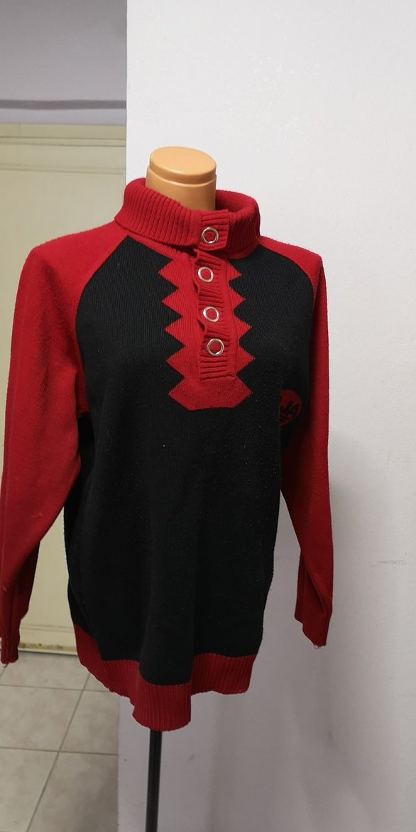 Düğmeli yüksek yakalı, uzun kollu, kırmızı siyah fitted örme kazak. Vintage goth tarzında, midi boyda ve desensiz, günlük kullanım için uygundur. Boyu 70cm iki kol arası 58cm 44 beden