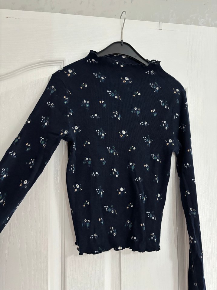yüksek yakalı ve uzun kollu, fit kesim mavi kadın bluz. Koyu renk ve baskılı desene sahip, günlük rahat stil için uygun.