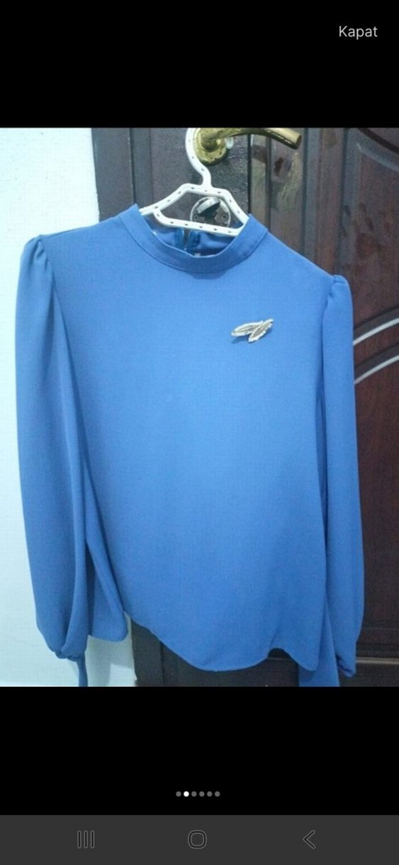 Düğmeli, yüksek yakalı, uzun kollu mavi kadın bluz. Rahat kesimli ve normal boyda, yumuşak ve sıcak dokulu kumaştan üretilmiştir. ✨