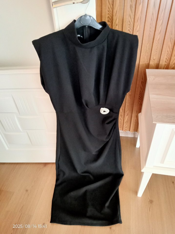 yüksek yakalı ve kolsuz, vücuda oturan siyah midi elbise. Düz ve koyu tonuyla çok şık.Hiçbir sorunu yok Az kullanılmıştır.Sadece 2 kere giyilmiştir. XL etiketli ama dar kalıp M ve L bedene rahatlıkla olur.Likralıdır.Kusurları kapatan bir modeldir