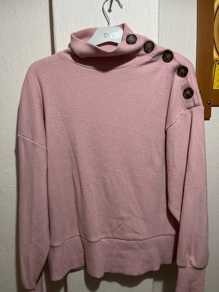 Pembe renkli triko kazak, düğmeli yüksek yaka ve uzun kolludur. Rahat kesimi ve normal boyu ile günlük kullanıma uygundur.