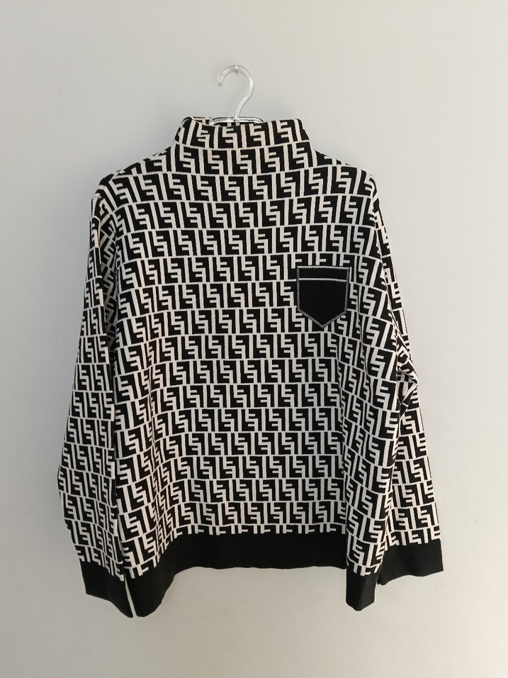 Kadın, bol kesim, uzun kollu ve yüksek yakalıdır. Siyah-beyaz desenli, siyah cepli, triko kaliteli kumaş
