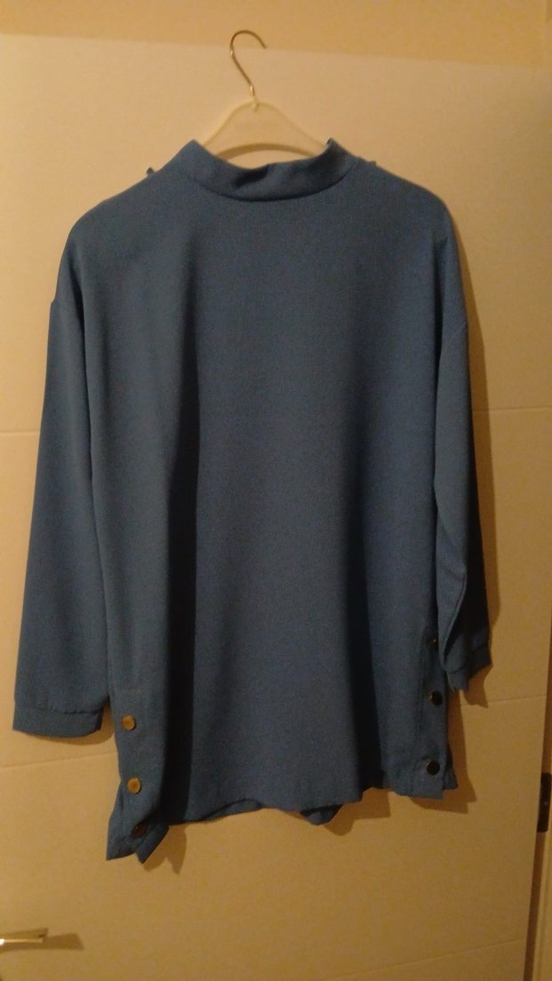 Düğmeli detaylara sahip uzun kollu, yüksek yakalı mavi bluz. Rahat kesimli ve yumuşak, sıcak tutan kumaştan üretilmiştir.