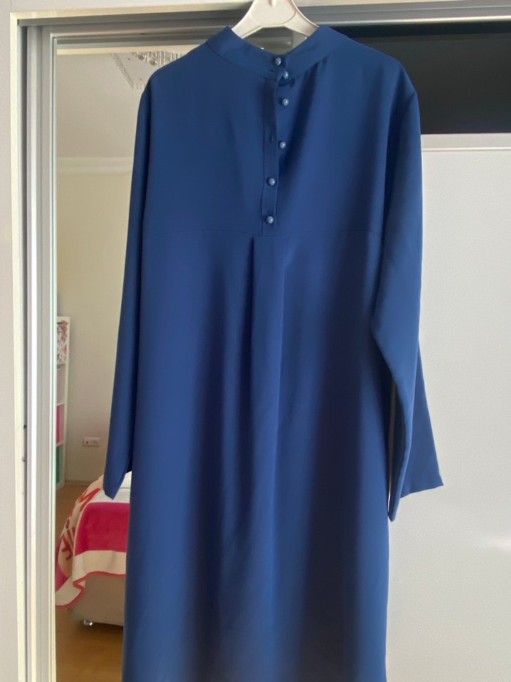 Düğmeli Yüksek Yakalı Uzun Mavi Tunik