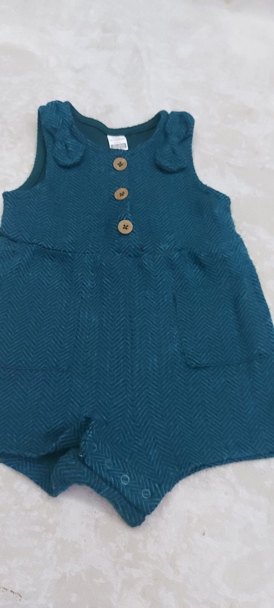 Düğmeli, yuvarlak yakalı petrol mavisi yün bebek tulumu. Rahat kesim, baskılı desenli ve mini boyda, günlük kullanım için uygundur. 12-18 ay beden.