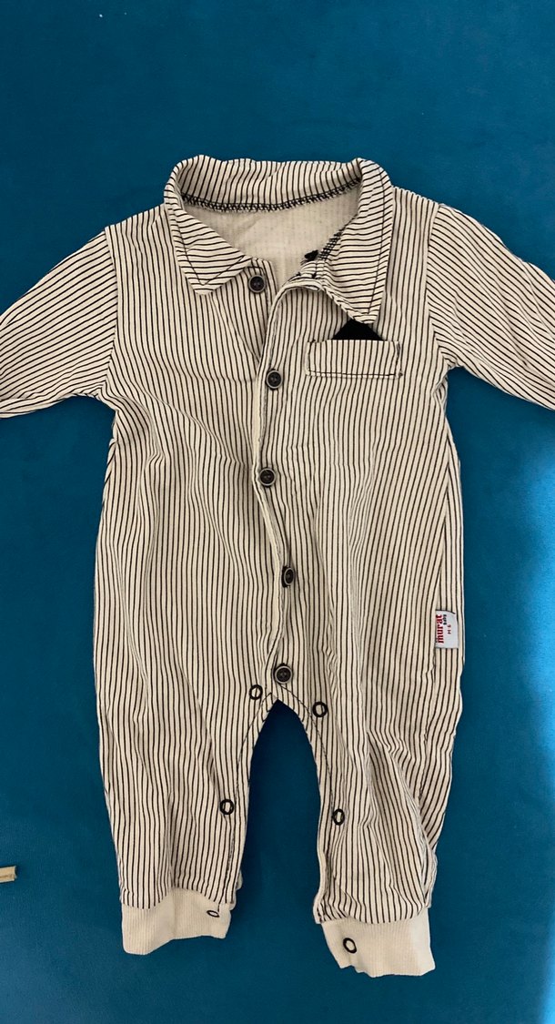 Uzun kollu, düğmeli ve yakalı gri zebra desenli bebek tulumu, yumuşak ve sıcak dokuda.