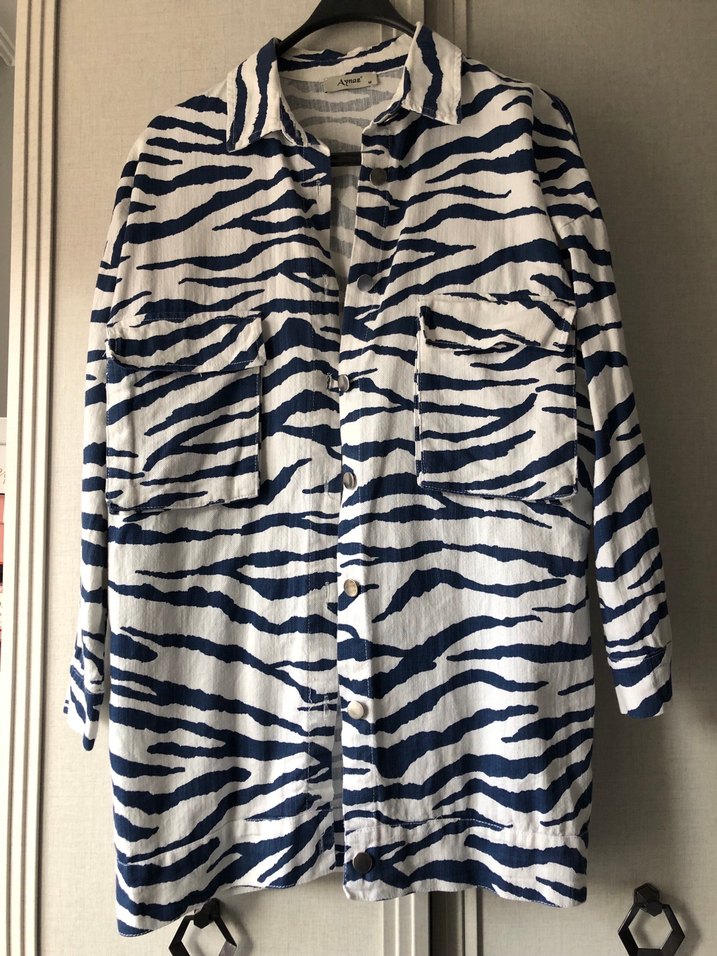 Yumuşak keten kumaştan, gümüş düğmeli cepleri ve yakalı kesimiyle, uzun kollu, salaş kesim zebra desenli kadın ceket. Rahat sokak stili için uygundur. uzunluğu 80cm