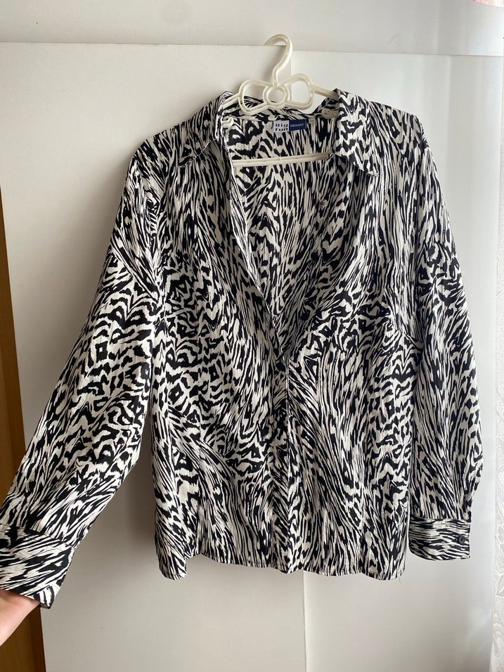 Geniş kesim, uzun kollu, düğmeli ve V yakalı kadın gömleği. Yumuşak sentetik kumaş üzerinde zebra desenli, günlük kullanıma uygun. Uzunluğu görselde verilmiştir.
