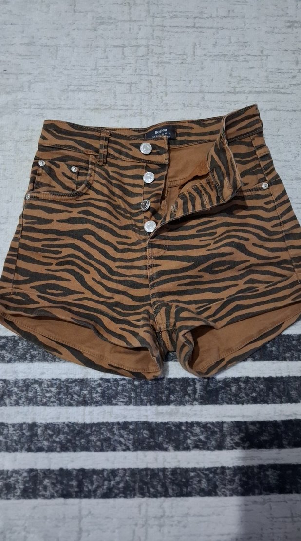 Düğmeli, kahverengi zebra desenli, sentetik kumaştan yapılmış, dar kesim mini şort. Trendy casual sokak stili için uygundur.