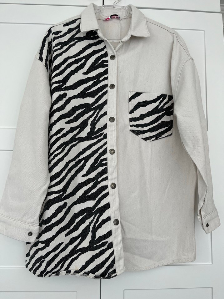 Zebra desenli, düğmeli, uzun kollu kadın gömlek.
