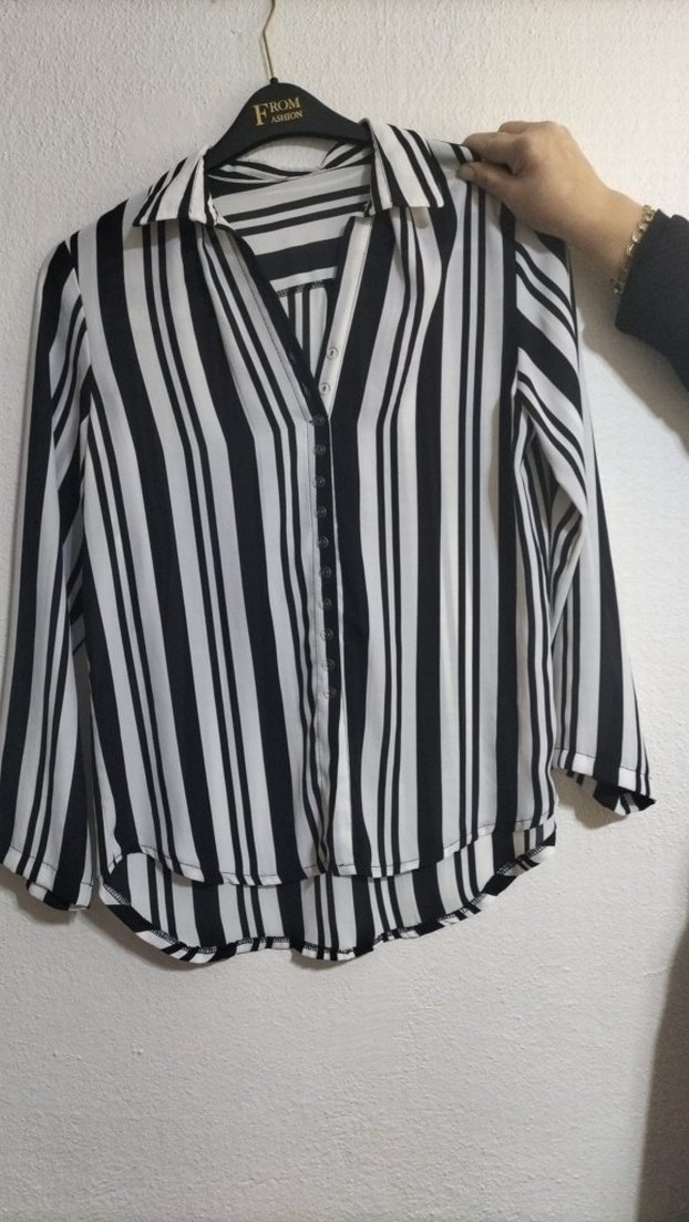 Düğmeli uzun kollu, V yakalı, bol kesim kadın gömlek. Beyaz ve gri zebra desenli, sentetik kumaştan. ikisi birlikte satılır. az kullanıldı.